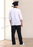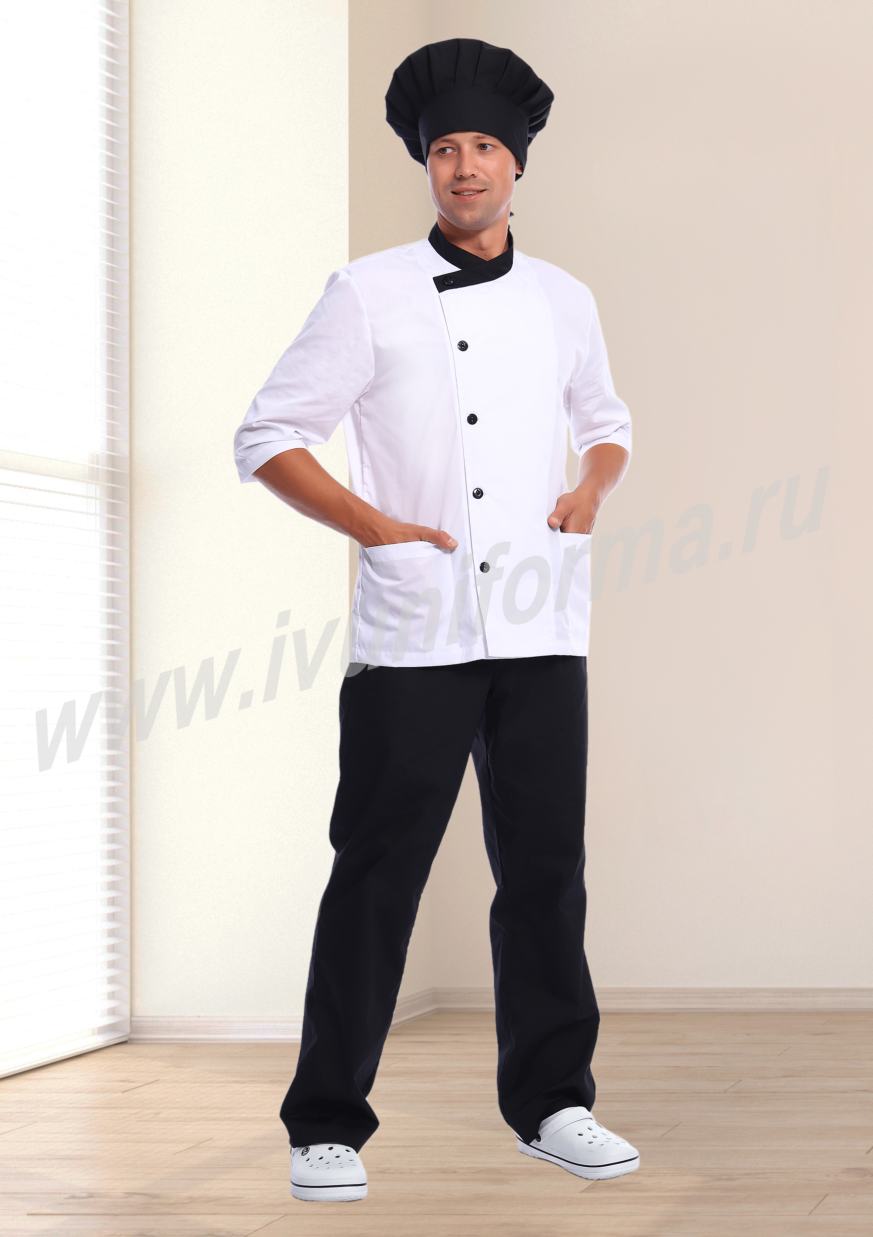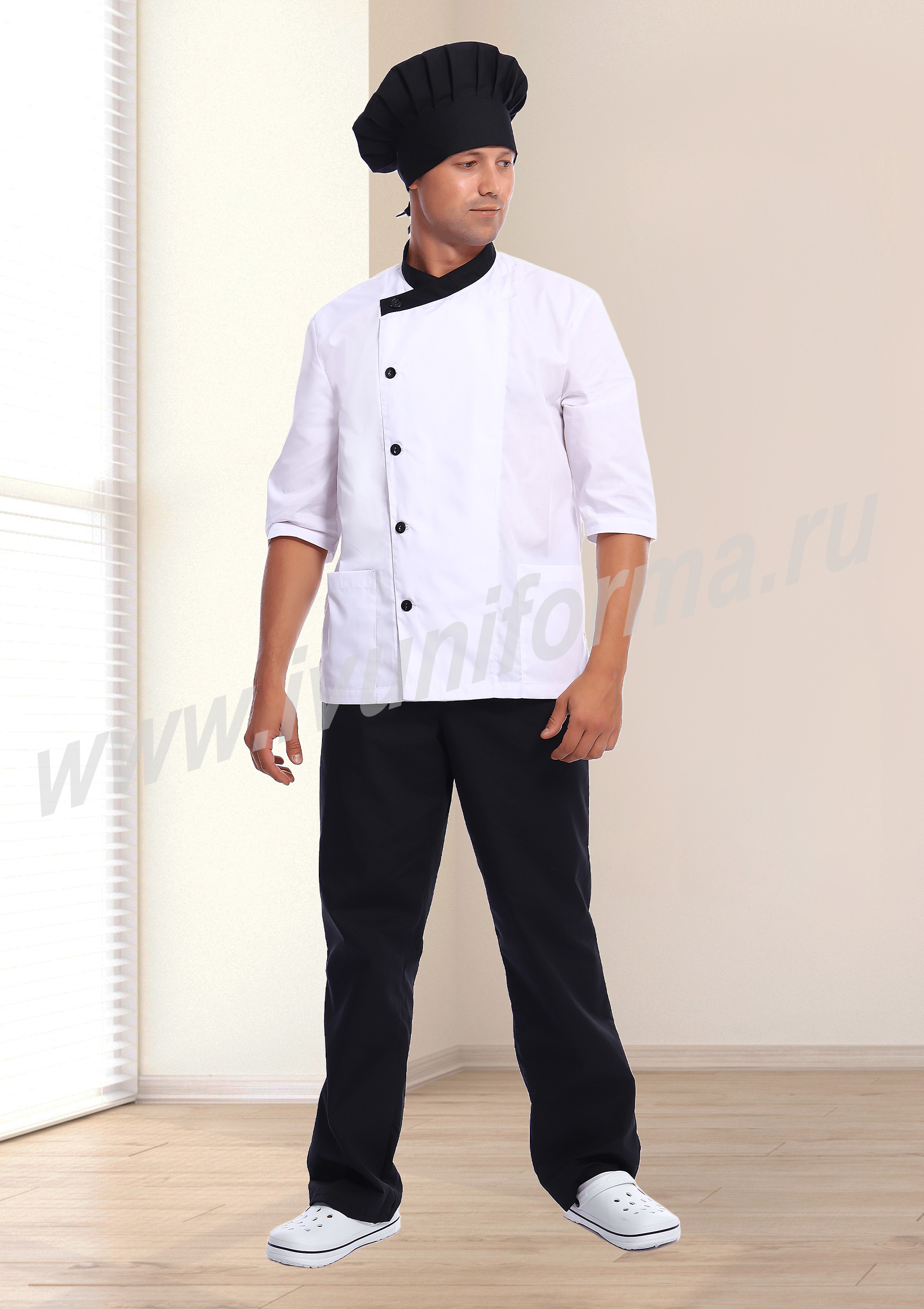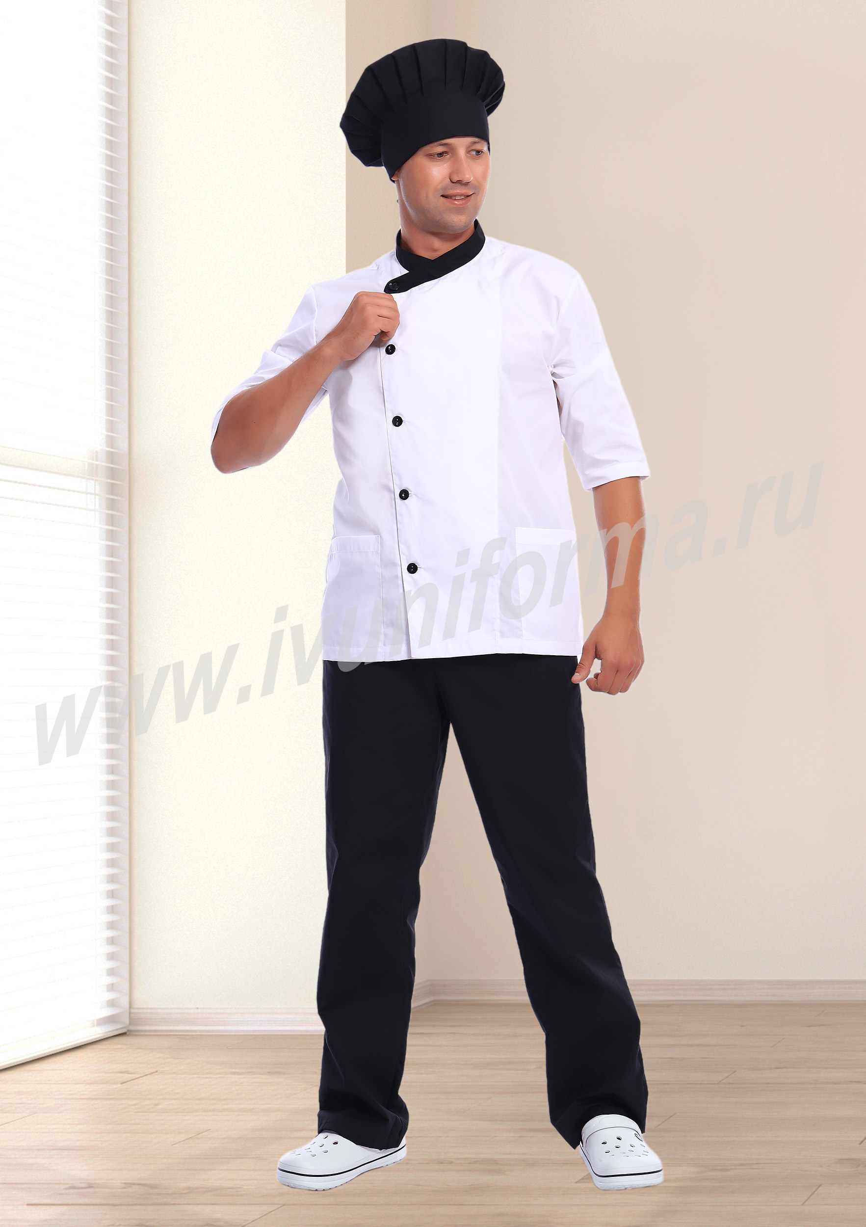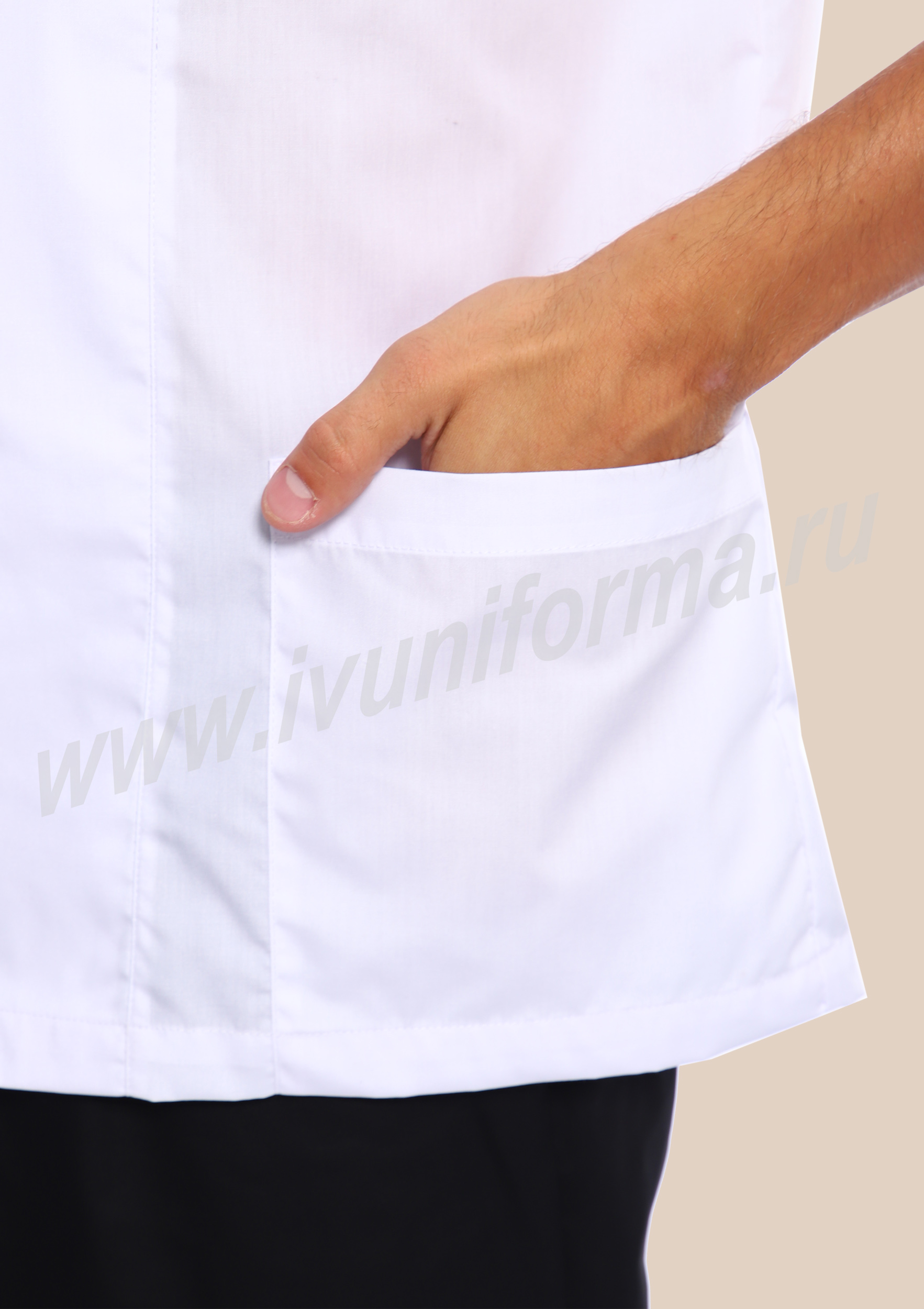 Современный мужской костюм состоит из куртки (кителя) и брюк. Куртка прямого силуэта средней длины со смещенной бортовой застежкой на петли и пуговицы. Полочка с вертикальными рельефами, выходящими из плечевых швов и вместительными накладными карманами в нижней части. Спинка со средним швом. Рукав втачной, длиной 3/4. Воротник стойка, выполненный из отделочного материала, удобен и функционален. Брюки прямые на эластичном поясе со вставкой для комфортной посадки на талии выполнены из отделочного материала. Костюм изготовлен из устойчивой к загрязнениям ткани, не сковывает движения и обеспечивает комфорт во время рабочего процесса, предназначен для работников пищевой промышленности.